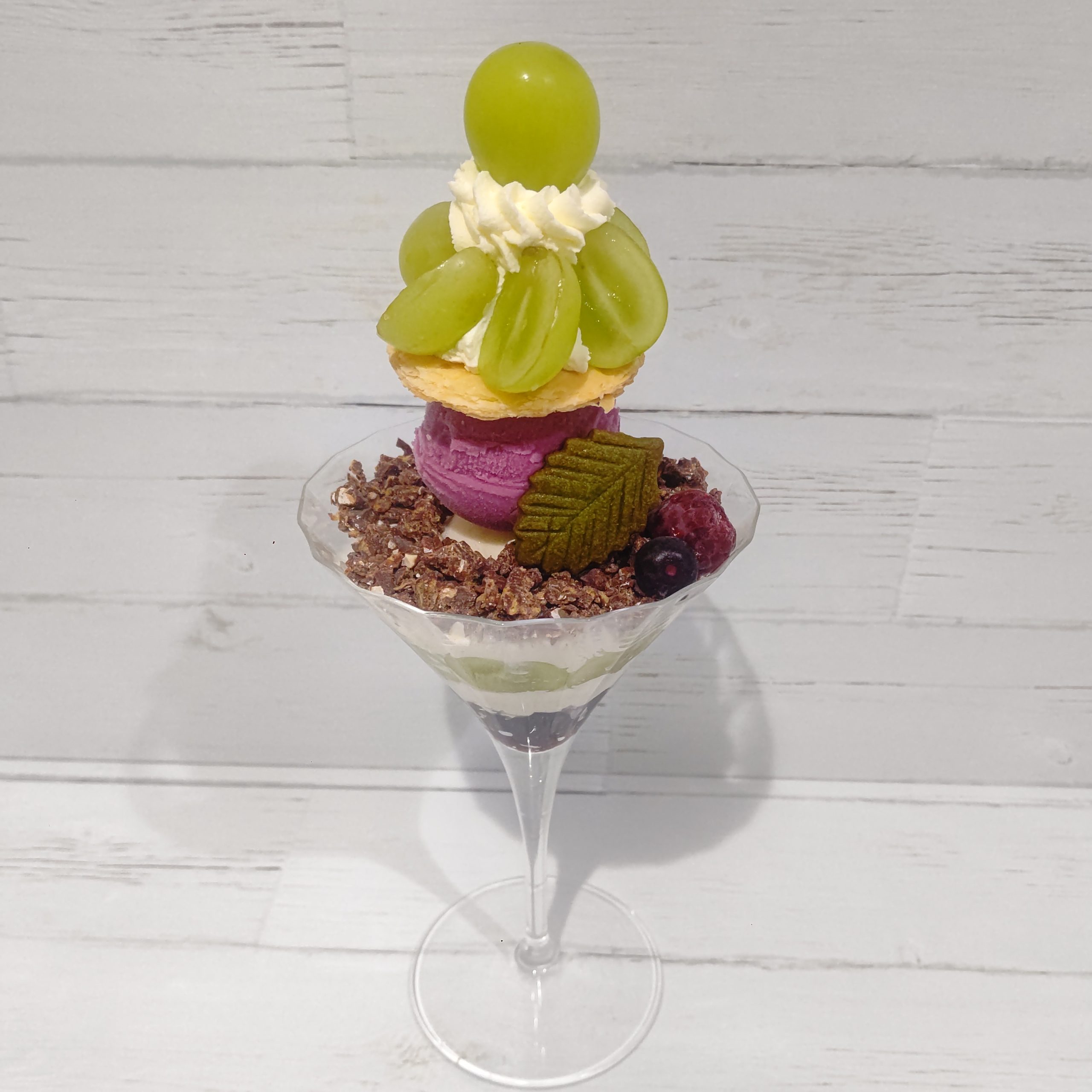 甘さ弾けるシャインマスカットにサクサクのミルフィーユを合わせ、ボトムには「スノーロイヤルバニラアイスクリーム」とシャインマスカット、葡萄ジュレをあしらいました。最後のひとくちまで葡萄をお楽しみください。