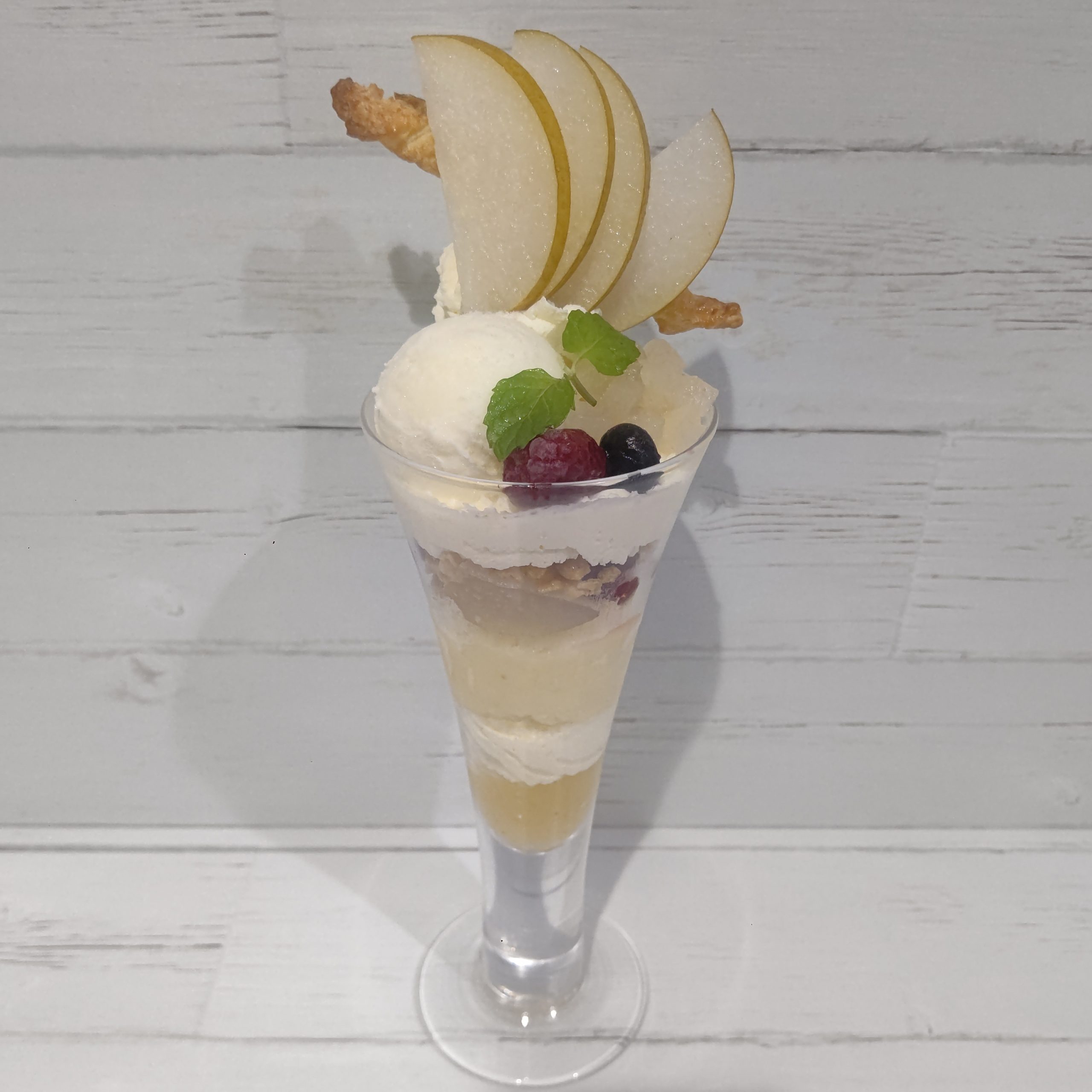 すっきり瑞々しい梨と「スノーロイヤルバニラアイスクリーム」を合わせ、秋を感じる和梨のスライスやコンポート、洋梨のソルベやジュレを使用し、とことん梨を感じられるパフェにしました。