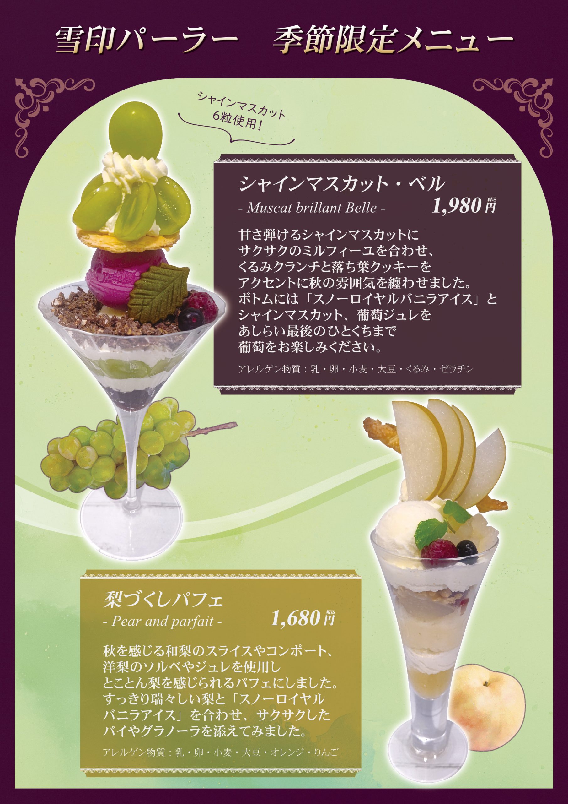 雪印パーラー本店では、10/1から秋限定メニュー「シャインマスカット・ベル」、「梨づくしパフェ」を販売いたします!